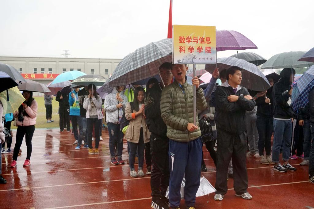 天公不作美,今天下着冷雨,刮着寒风,但是数院的运动健儿们仍顶着寒风与冷雨,在寒冷的田径场上挥洒着如热火一般的青春,赢得了观众席上同学们的阵阵喝彩。在场上的各位工作人员们冒着风雨坚守自己的岗位,让校运会井然有序地进行。百米决赛中,雨中奔跑的运动健儿们勇往直前永不退缩;接力赛中,运动健儿们迈着飞快的步伐,顺利完美地交接;长跑决赛中,运动健儿们的坚强的毅力和顽强的意志,决不放弃的信念,感动着我们。