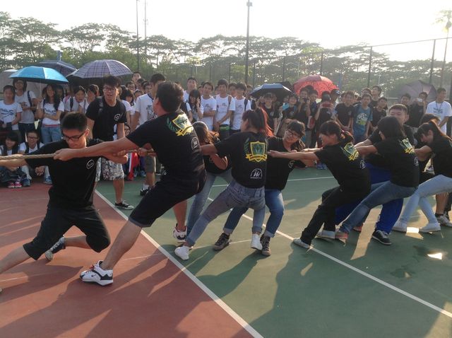 尽管烈日当空,也比不过数院小伙伴们参赛的热情。13级新生们都穿上了各自班级设计的班服,为各自班级加油助威,但每件班服的背面都有共同的数院标志,更烘托出一种浓浓的数院氛围。虽然比赛场地限制在一条绷直的麻绳所控制的范围内,但场上选手们齐心协力、争取到底的精神表现得淋漓尽致,展现出数院新生们顽强拼搏、不轻易放弃的精神风貌!同时,导生和导助们也组成一队,在这同一条直线上与可爱的新生们进行了较量,突出了本次比赛竞争与友谊共存、场上较量和数院情怀融为一体的特点。