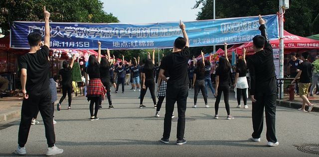 随着音乐的响起,先由舞队给我们带来前段精彩的开场舞,而后整个团委学生会的成员共同完成精彩的开场舞。最后,在热烈的掌声中,数学嘉年华正式开始了。红棉路的每一个角落都充斥着似火的热情,安静的校园顿时成为了欢乐的海洋。五颜六色的气球、做工精致的招贴画、周围四处飘舞的彩丝带,无一不在渲染着这个欢乐的时候。