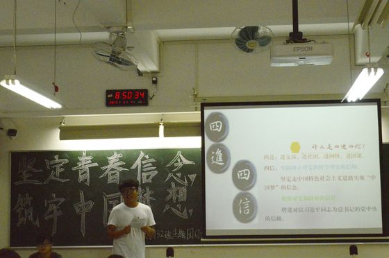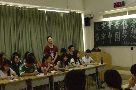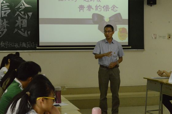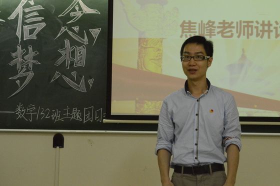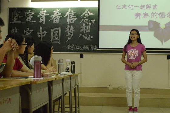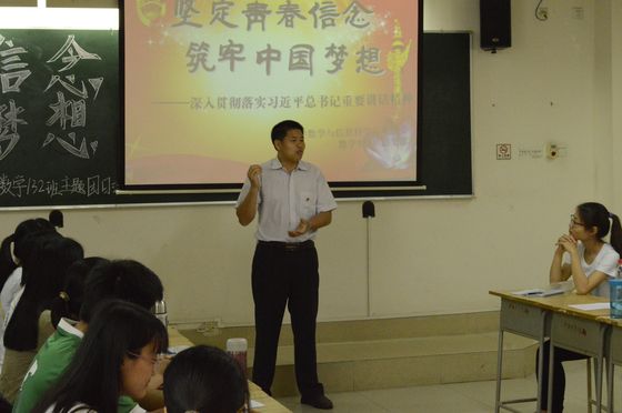“十佳”学生黄兹檀分享了自己的青春故事,提出自己对青春信念的见解。她说:“困难不是给别人机会可怜你,而是给自己机会发现更强大的自己。”对于每个大学生来说,我们应该脚踏实地地学好专业知识,创造人生价值。数学13(2)班团支部书记黄紫娟、年级党支部副书记陈金霞同学等也纷纷结合自己大学两年来生活、学习经历表达对习近平总书记重要讲话精神的理解。在学生分享了自己的感言后,杜亚辉老师从历史的角度更深层次地解读了五四精神,他认为五四精神的根本要义在于对民主和自由等文明观念的启蒙,并鼓舞同学们活在当下,关注国家大事。班主任焦锋老师也提出自己对青春的看法,他认为不论处于哪个年龄阶段,只要有一颗积极、向上、进步的心,那就是青春。处于青春期的大学生,应该从大事,小事两方面要求自己。小事要做到不旷课、不迟到、不抄作业,大事要做到不怕失败并让读书成为一种习惯。最后,学院党委副书记曾学毛同志对本次团日活动做了总结,他告诉同学们要铭记历史,忘记历史是一种背叛。并以叙利亚人民的生活与我们今天的生活作比较,指出平常的幸福可能是别人的奢望,国家富强文明才有个人的幸福生活。所以,大学生应该做一名有担当,有追求的青年。在人生的道路上,大学生要有理想,有信念,更要有行动。