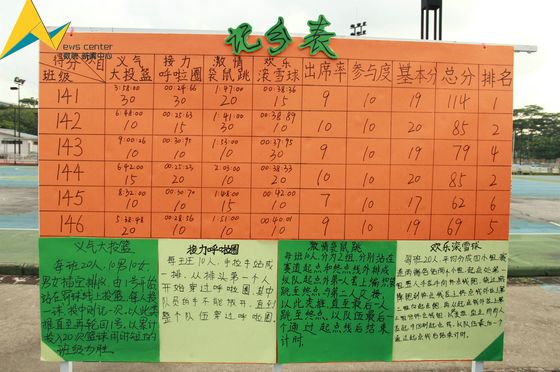 本运动会有四项比赛,分别为义气大投篮、接力呼啦圈、激情袋鼠跳、欢乐滚雪球。每一项无不考验着大家的团队合作精神。在介绍游戏规则和真人演示游戏之后,比赛正式开始。第一项,义气大投篮,在篮筐下,随着一球又一球地投篮,迎来了场下一阵又一阵的欢呼声,数学141班率先完成20个球,赢得第一局的胜利;接下来是接力呼啦圈,一个呼啦圈,大家手牵手,共同完成一个呼啦圈的传递,这需要极大的默契。数学141班默契飞非常,再度领先,将其他队伍甩得远远的。但在激情袋鼠跳时,新生难免受伤,红会的干事们赶紧带来医药箱进行处理,并让受伤的新生在大本营休息。最后的欢乐滚雪球,一群手拉手在赛道上奔跑,矫健的步伐中带着奔向终点的执着。四轮角逐后,141班以总分114分的成绩荣获第一名,数学142班和144班均以85分的成绩获得第二名。最后在宣布活动结束后,本届趣味运动会划上了圆满的句号。
