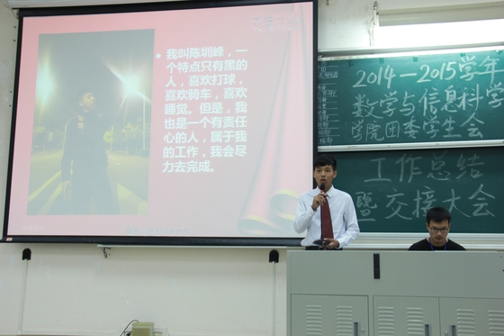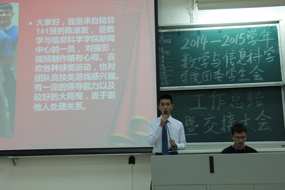 年年岁岁花相似,岁岁年年人不同,换届为主席团注入了新的血液。新一届主席团是由团委副书记梁碧和刘奕泠,学生会主席邝俊炜,学生会副主席邓文杰和江绮文,学生会秘书长钟伟君,杏吧视频主任欧阳淑玲组成。主席团的各位做了就职演讲,新一届的主席团在前一届的基础上积累,传承和发扬。团委的新部长,学生会的新部长以及杏吧视频的副主任逐一上台演讲,对本部门未来工作的展望,同时,也展现了新一届主席团以及部长们的风貌。