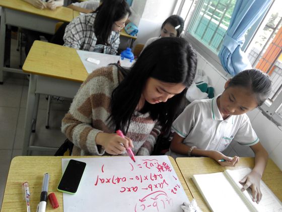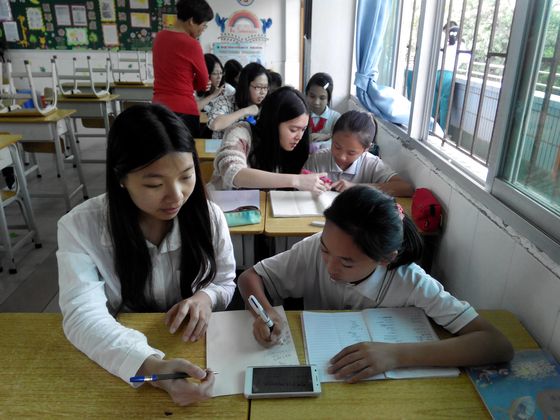 下午刚开始上课时,有的学生因为还不适应“新老师”的到来,表现得比较害羞,不敢主动向“老师”提问题。但是我们的“小老师”主动大方,热情积极,很快就把整个班的学习氛围提起来了。慢慢地“老师”和学生都投入到教学当中,“老师”仔细耐心地讲,学生认真地看、听、练习,遇到不懂的地方还会请求老师多讲一遍。教室里不时还会发出小小的笑声。经过一个多小时的交流之后,“小老师”和小学生产生了师生情,下课后,可爱的小朋友们含情地把“小老师”送出教室门,甜甜地说了声“谢谢老师”。深井小学的陈老师也给了我们较高的评价。