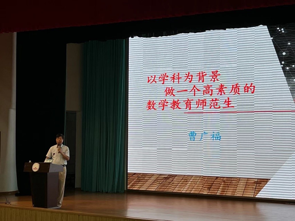 曹广福教授为大会做了“以学科为背景做一个高素质的数学教育师范生”的专题报告,曹教授对师范生的基本技能进行了梳理,关注如何将大学数学中所蕴藏的思想方法运用到初等数学等核心问题,并结合数学史,用向量及分数的案例进行了分析,深受师生好评。