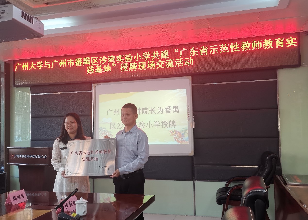 与沙湾实验小学共建教师教育实践基地的授牌仪式在沙湾镇举行,沙湾教育指导中心郭锡华主任、沙湾实验小学郭凤喜校长、沙湾象骏中学潘桂洪副校长,以及学院钟育彬副院长出席了挂牌仪式。