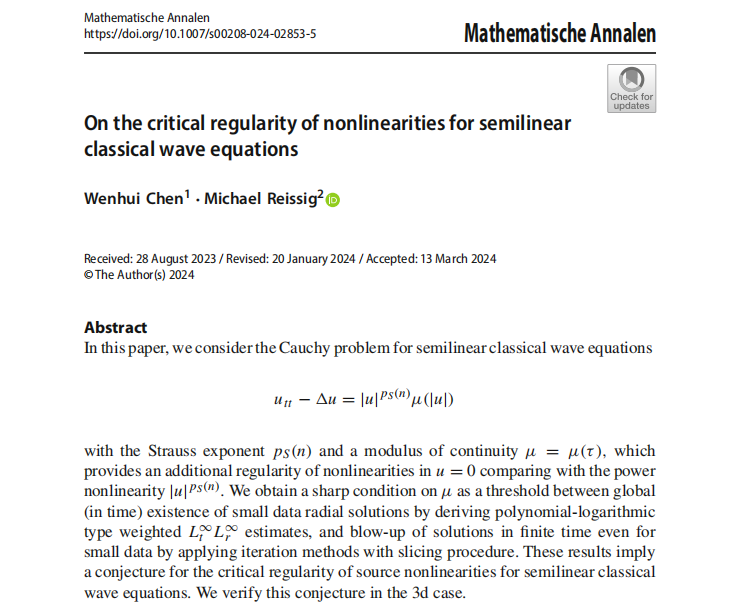陈文辉副教授,与德国TU Freiberg的Michael Reissig教授合作在国际顶级数学期刊《Mathematische Annalen》(德国数学年刊)上发表学术论文。这是继2023年之后,陈文辉再次在此刊发表论文。