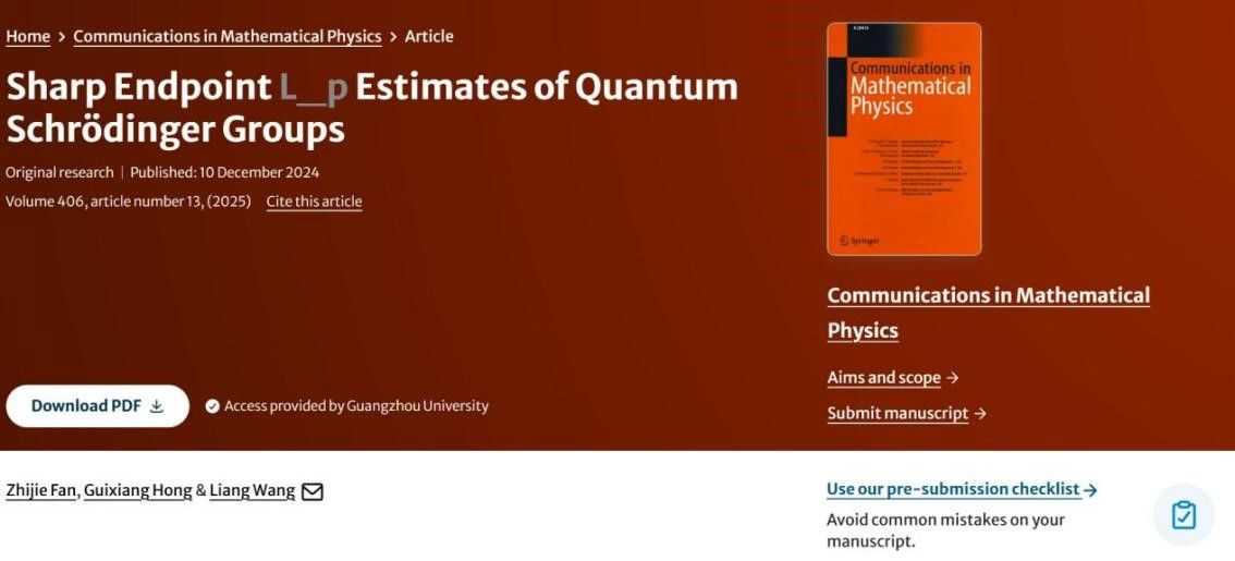 博士后范智杰与哈尔滨工业大学洪桂祥教授及武汉大学王亮博士合作,完成了量子Schrödinger群的最佳Lp估计的研究工作。相关研究结果发表在国际顶级数学物理期刊Communications in Mathematical Physics。
