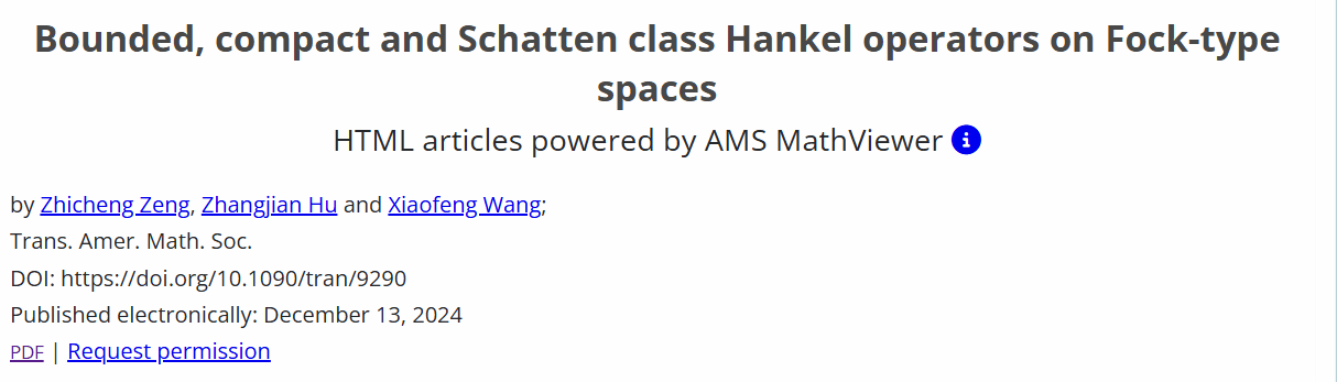 博士生曾志城与导师王晓峰教授、湖州师范学院教授胡璋剑合作,完成了Fock型空间上Hankel算子的有界性、紧性及Schatten类的研究,相关结果发表在数学类顶级刊物Transactions of the American Mathematical Society。