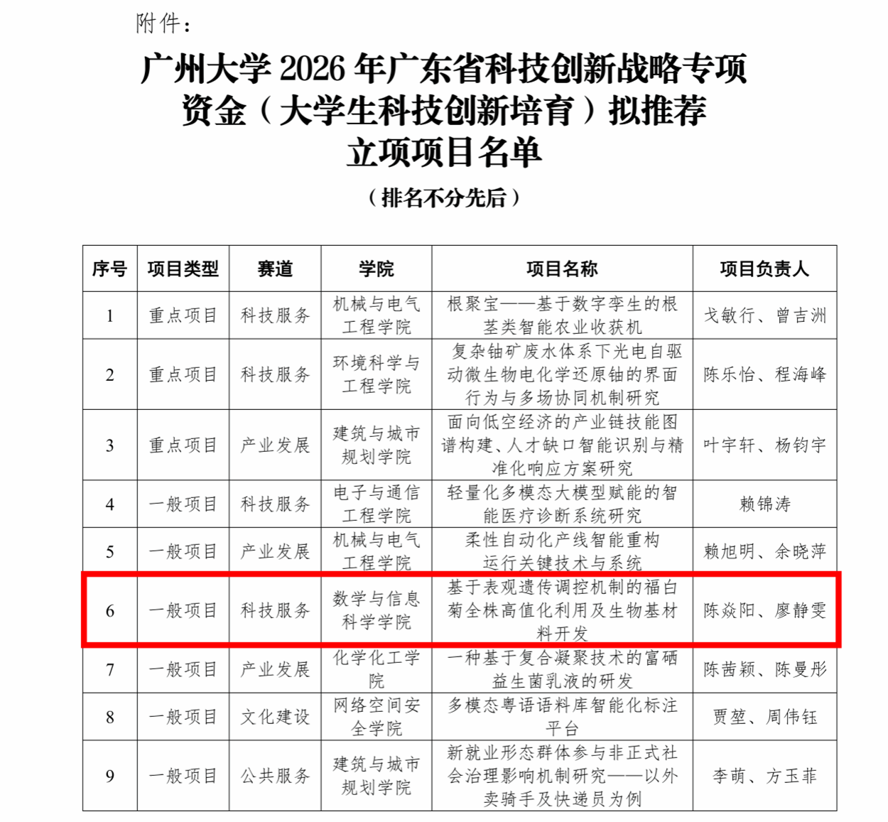 数学241班陈焱阳同学负责的《基于表观遗传调控机制的福白菊全株高值化利用及生物基材料开发》项目成功入选省级拟推荐立项项目名单,这一成果充分展现了杏吧视频