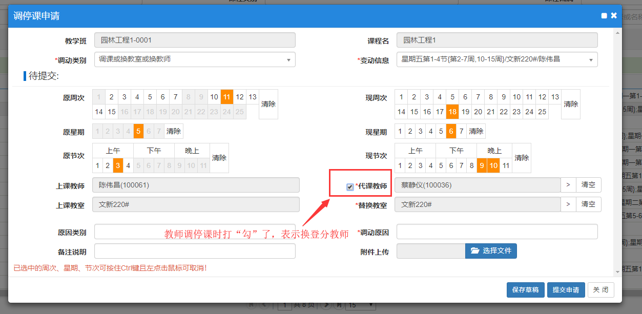 2)若仅需要更换教师或教室,则可以在保持变动前的周次,星期,节次信息(以上第(3)小点)与变动后的周次,星期,节次信息(以上第(4)小点相同的情况下,选择“代课教师”或“替换教室”予以更换(以上第(5)小点)。