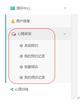 5.完善个人信息后,即可进行咨询预约操作。选择左侧栏 “心理咨询”,便可看到该栏目下的所有功能模块: