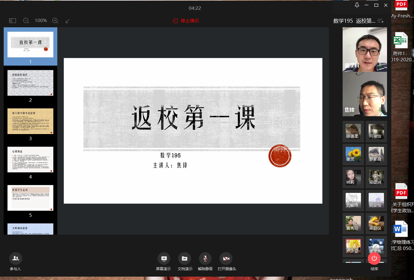 各年级各班开展了“返校第一课”,由各班班主任向班级同学主持并传达疫情防控知识、线下教学和考试纪律、心理调适、安全教育和人文关怀。其中,杏吧视频